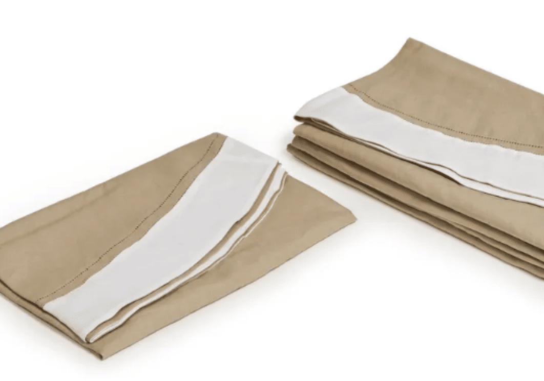 Nappes rondes, beige et blanc, diamètre 120 cm.